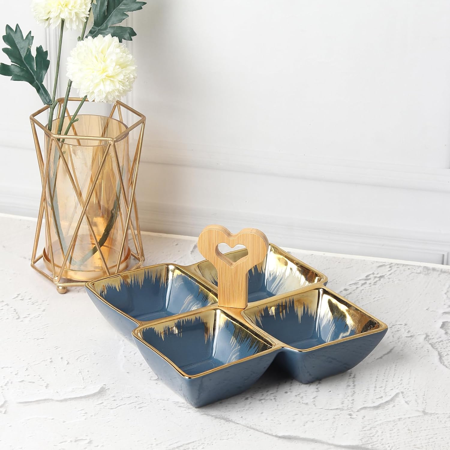Upgrade your serveware collection with this elegant blue ceramic quad-part platter, designed for both style and practicality. Featuring a luxurious gold rim and a sturdy bamboo handle, this high-quality food-safe serving dish is perfect for nuts, chips, snacks, desserts, fruits, dips, chutneys, pickles, and other condiments. The four-section design allows easy organization and elegant presentation, making it an ideal choice for home dining, festive occasions, and parties. Its glossy ceramic finish enhances the aesthetics of your table setting. Available in two stunning shades – Cream & Blue, this versatile, durable, and easy-to-carry platter is a must-have addition to your kitchen.