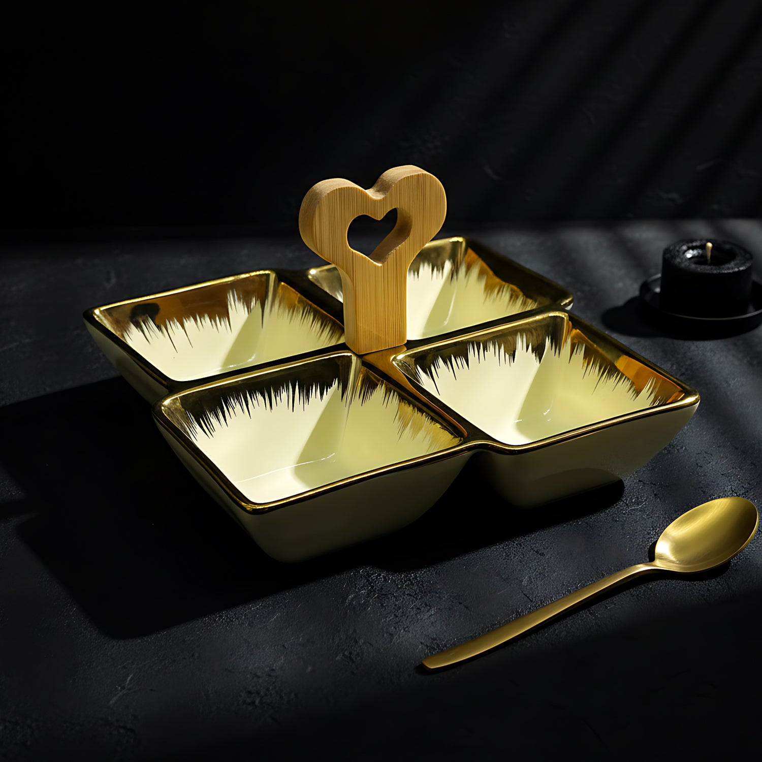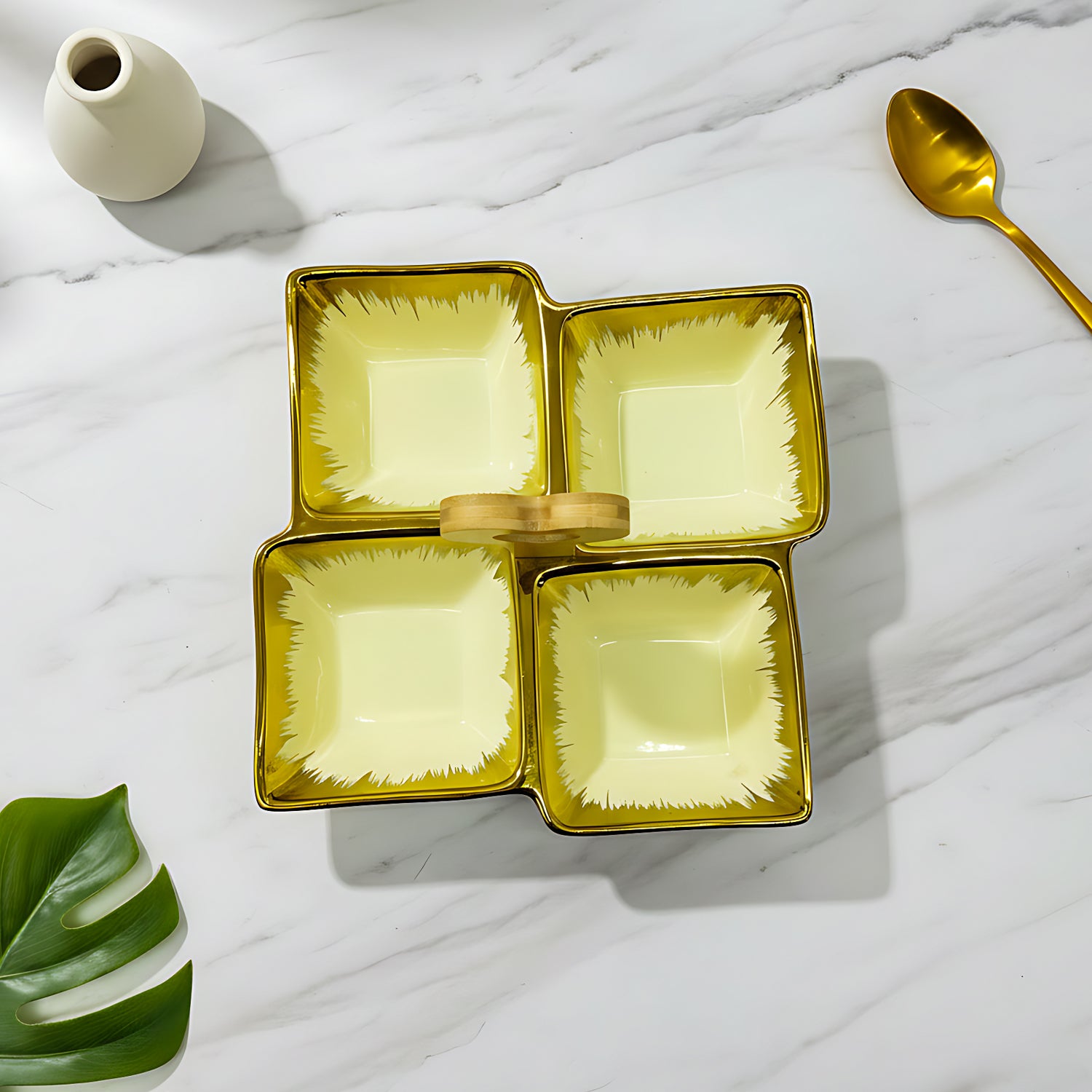 Serve in style with this sophisticated cream ceramic quad-part platter, designed for effortless entertaining. With four spacious sections, a sleek gold rim, and a natural bamboo handle, this premium-quality serving dish is perfect for snacks, nuts, dips, chutneys, pickles, fruits, and desserts. The high-gloss finish enhances its aesthetic appeal, making it a centerpiece-worthy addition to any table setting. Crafted from durable, food-safe ceramic, this platter is both functional and elegant, ideal for home gatherings, festive occasions, and everyday dining. Available in two timeless shades – Cream & Blue, it's a must-have for those who love stylish serveware.