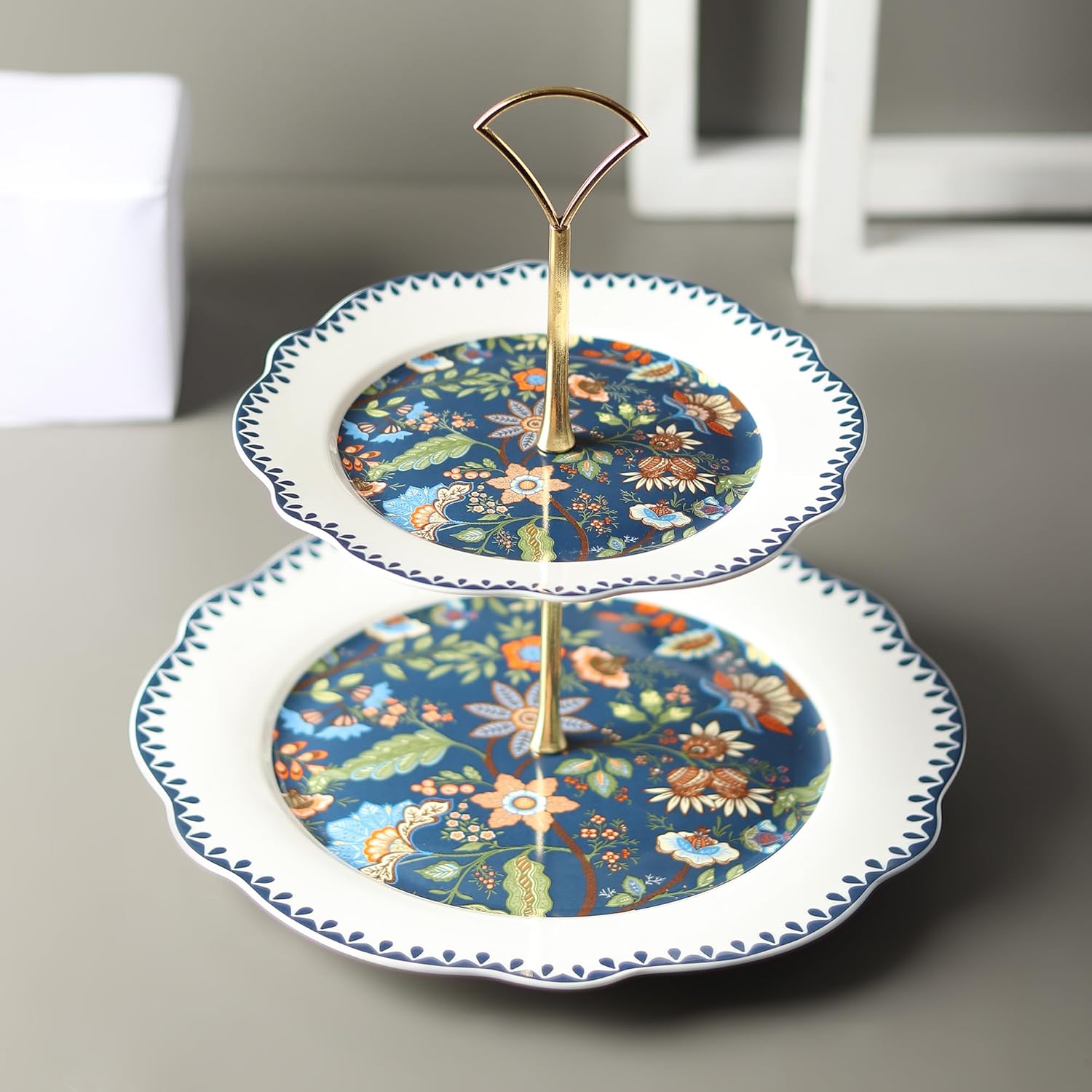 Add a touch of elegance to your table with this 2-Tier Fine Porcelain Cake & Snack Stand. Designed with an exquisite blue floral pattern and gold-tone metal handle, this stand is perfect for serving cakes, pastries, snacks, and more. The scalloped white edges enhance its charm, making it an ideal choice for high-tea parties, weddings, or festive celebrations. Crafted from premium porcelain, it offers durability, sophistication, and ease of maintenance. The set comes in an attractive gift box, making it a thoughtful present for loved ones.