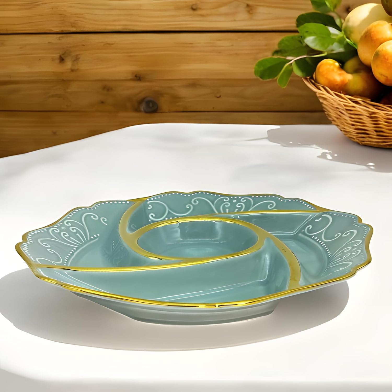 Serve your snacks in style with this Round Deep Partition Platter, designed with a central dip slot for a delightful serving experience. Crafted from premium ceramic with a luxurious golden rim design, this multi-purpose platter is perfect for chips and dip, nuts, desserts, nachos, fruits, and more. Available in three charming pastel shades – Pink, Blue, and Green, this elegant serving dish blends functionality with sophistication, making it an ideal addition to any modern kitchen or dining setup. Durable, stylish, and easy to clean, this platter is perfect for casual and festive gatherings.