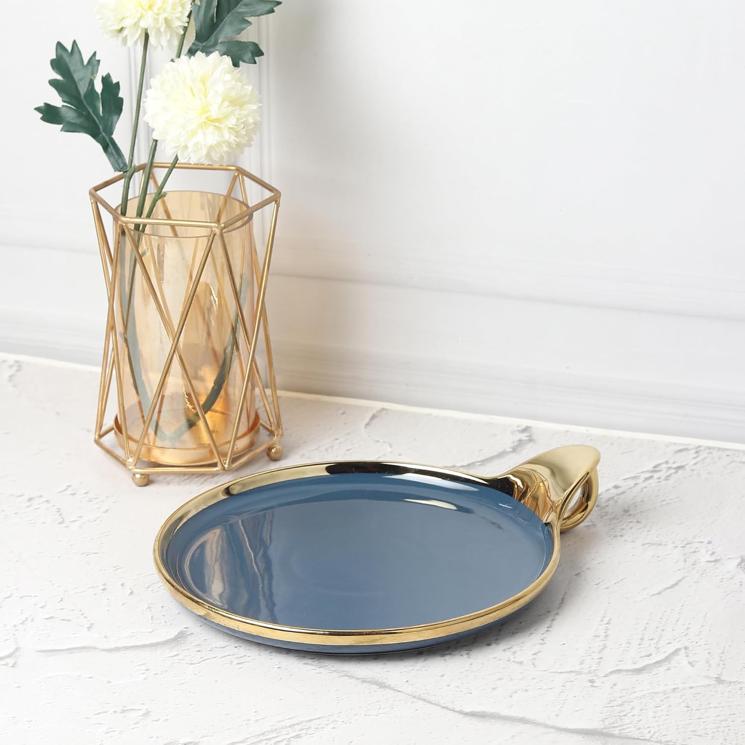 Upgrade your dining experience with this luxurious blue round ceramic serving platter, designed with a sophisticated golden rim and a unique hook-shaped handle for effortless serving. Crafted from high-quality food-grade ceramic, this 24cm x 20cm x 4cm flat platter is perfect for serving snacks, desserts, salads, fruits, and more. The sleek, shiny finish enhances any table setting, making it a great choice for home use, parties, and gifting. Available in Cream, Blue, and Brown, this elegant platter adds charm to your dining collection.