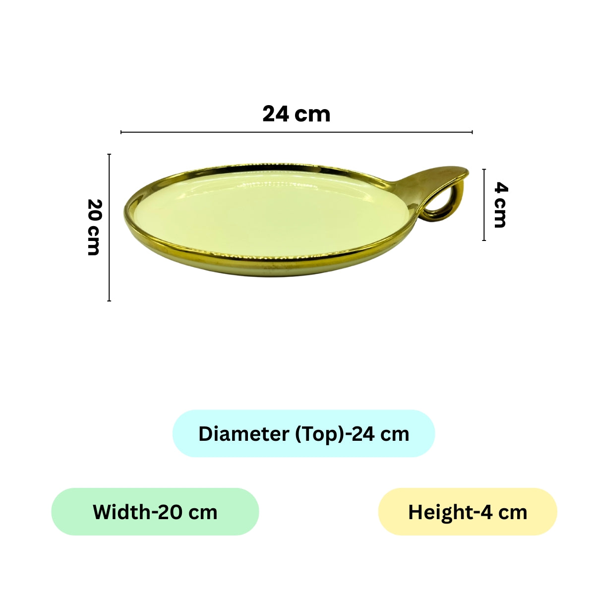 Add a touch of elegance to your dining experience with this stunning cream-colored round ceramic serving platter. Designed with a golden rim and a unique hook-shaped handle, this premium-quality, food-safe ceramic plate is perfect for serving snacks, desserts, fruits, salads, and more. The sleek, modern design with a glossy finish enhances your table setting, making it an ideal choice for daily use, gatherings, and special occasions. Available in Cream, Blue, and Brown, this versatile 24cm x 20cm x 4cm platter is a must-have for stylish table decor.
