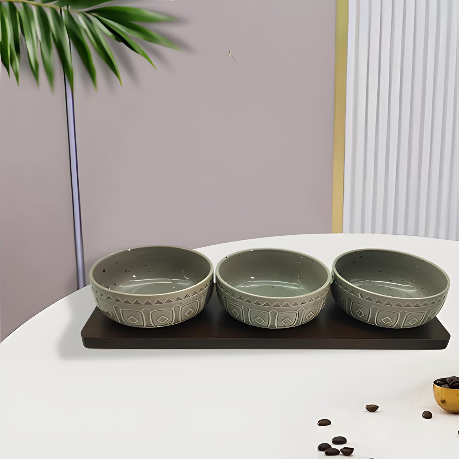 Enhance your dining experience with this sophisticated grey ceramic 3-bowl set with a bamboo base tray. Perfect for serving chutneys, dips, pickles, nuts, desserts, snacks, and fruits, this versatile serveware is a stylish addition to your kitchen or dining table. The self-embossed ceramic bowls offer a touch of elegance, while the eco-friendly bamboo base provides stability and ease of use. Available in three chic pastel shades – Beige, Blue, and Grey – this set is an ideal choice for both everyday use and special occasions.