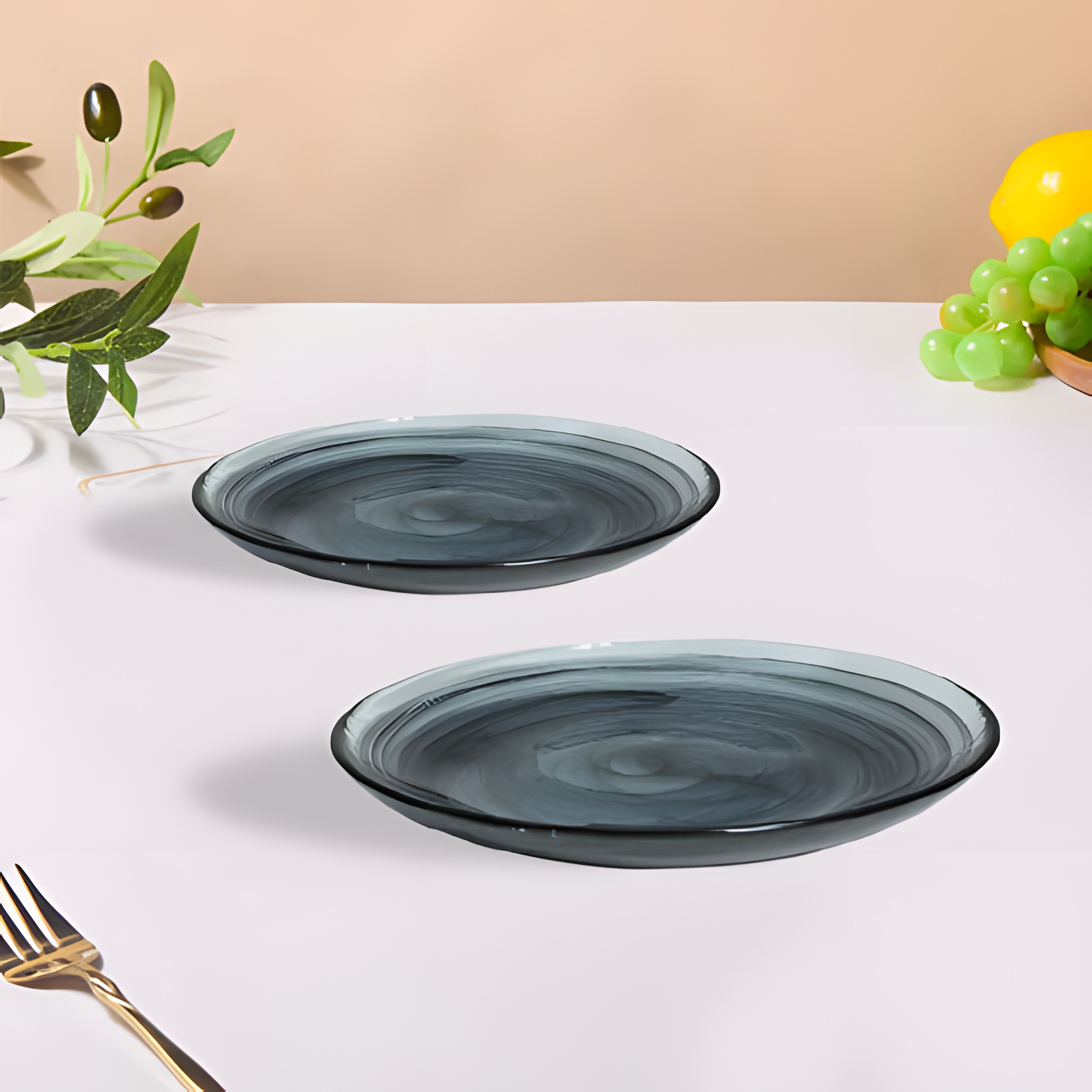 The HK1104-2 Lemon Tree Black Handmade Glass Quarter Plate Set consists of two 8-inch round glass plates, precisely measuring 20.5x20.5x2.2 cm. Featuring a stunning glossy black alabaster finish, these luxury handmade glass plates are perfect for serving snacks, desserts, cakes, fruits, and appetizers. Designed for elegant and modern table settings, this set is microwave and dishwasher safe, offering effortless convenience with a stylish touch.