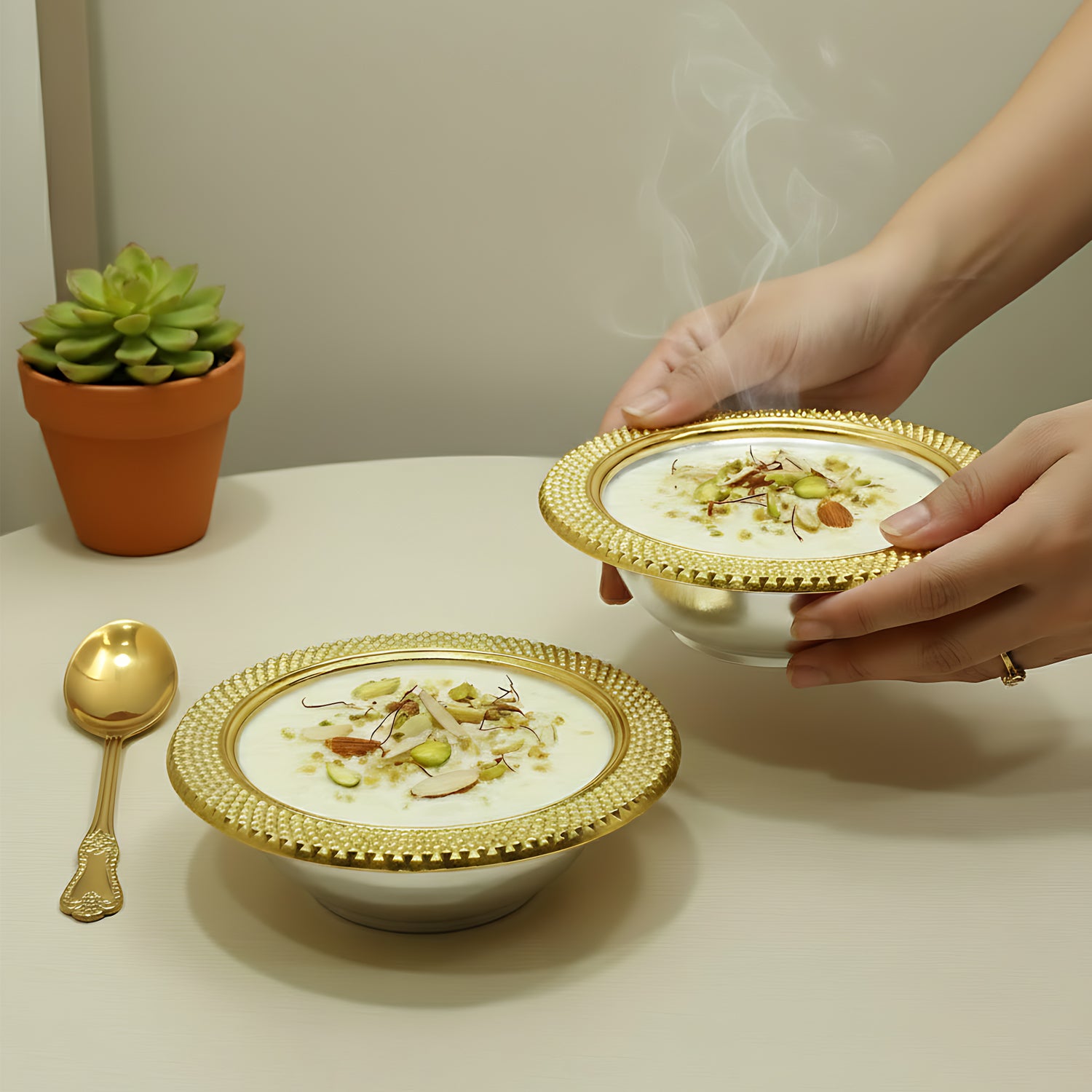 Discover timeless elegance with Lemon Tree 2pc German silver plated metal round bowl set, each 6-inch (350ml) bowl showcasing sophisticated gold and silver matt finishes—packaged in an attractive gift box for stunning presentation of nuts, savouries, desserts, and more.