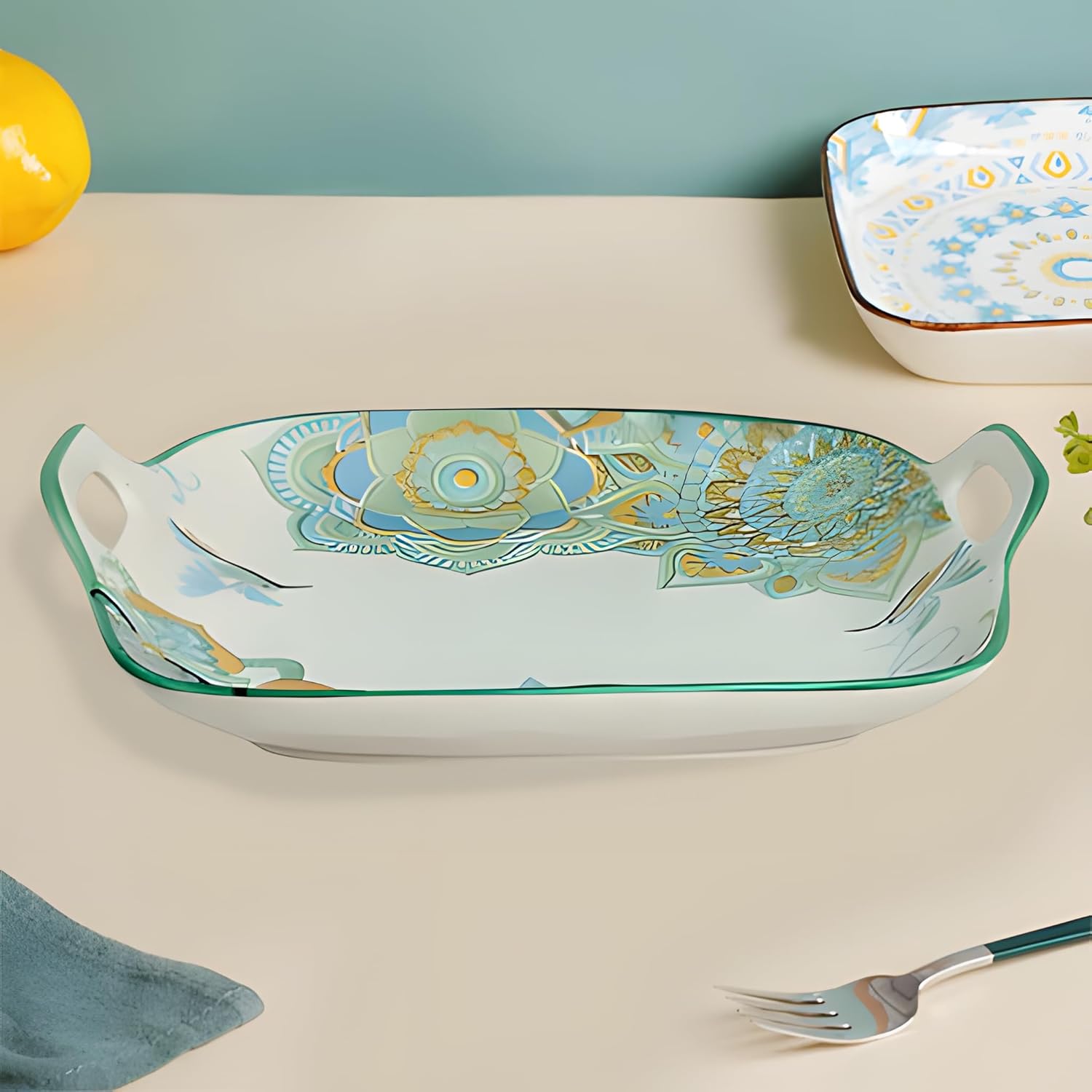 Upgrade your serveware collection with the Lemon Tree Blue Ceramic Square Platter, designed with a smooth matte finish and stylish printed design. The double ear handles provide a comfortable grip, making it easy to serve a variety of dishes. Whether you're serving snacks, salads, pasta, fruits, cookies, or desserts, this versatile deep dish platter ensures a sophisticated dining experience. Made from high-quality ceramic with a durable glazed coating, it's perfect for home, restaurants, parties, and gifting. Add a modern and artistic touch to your table setting with this functional and aesthetic platter.