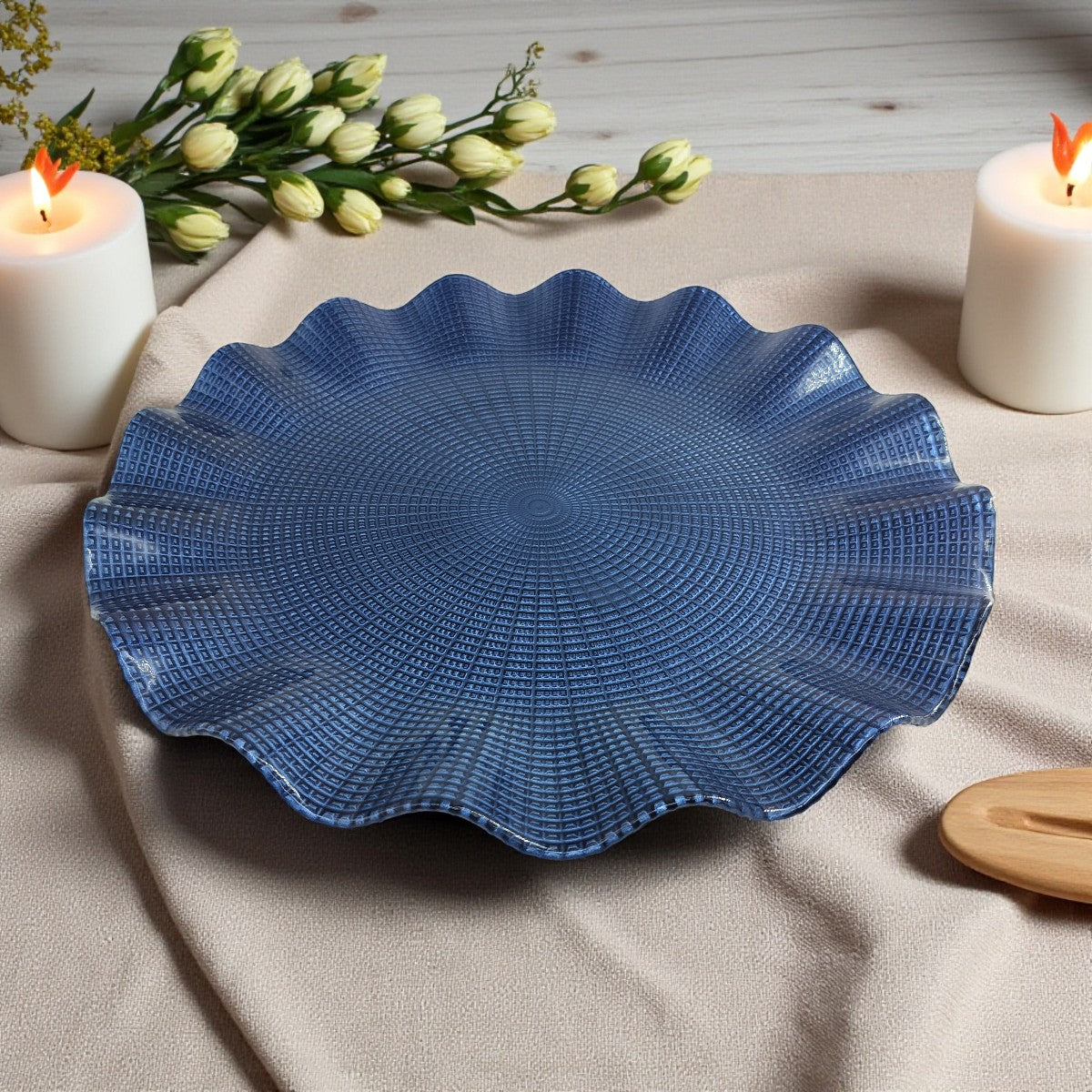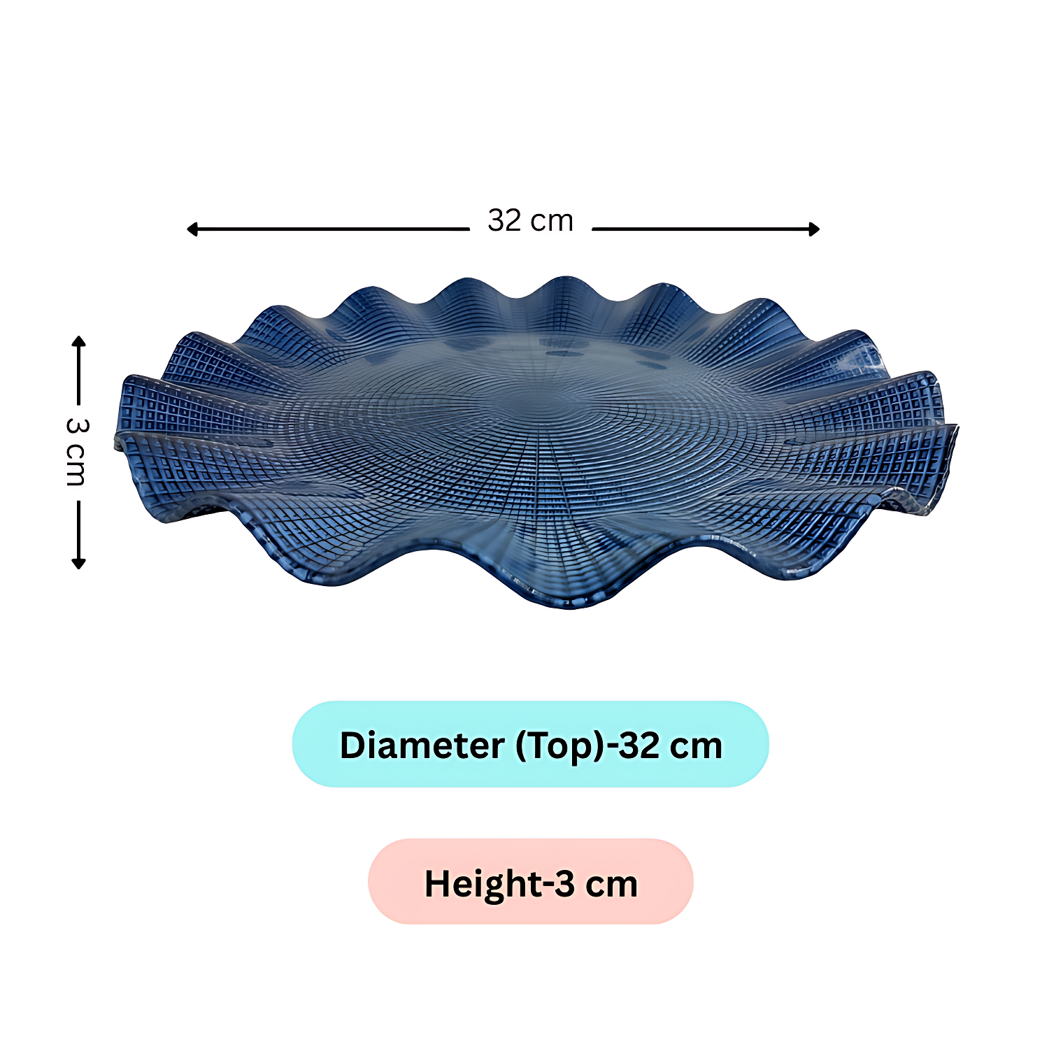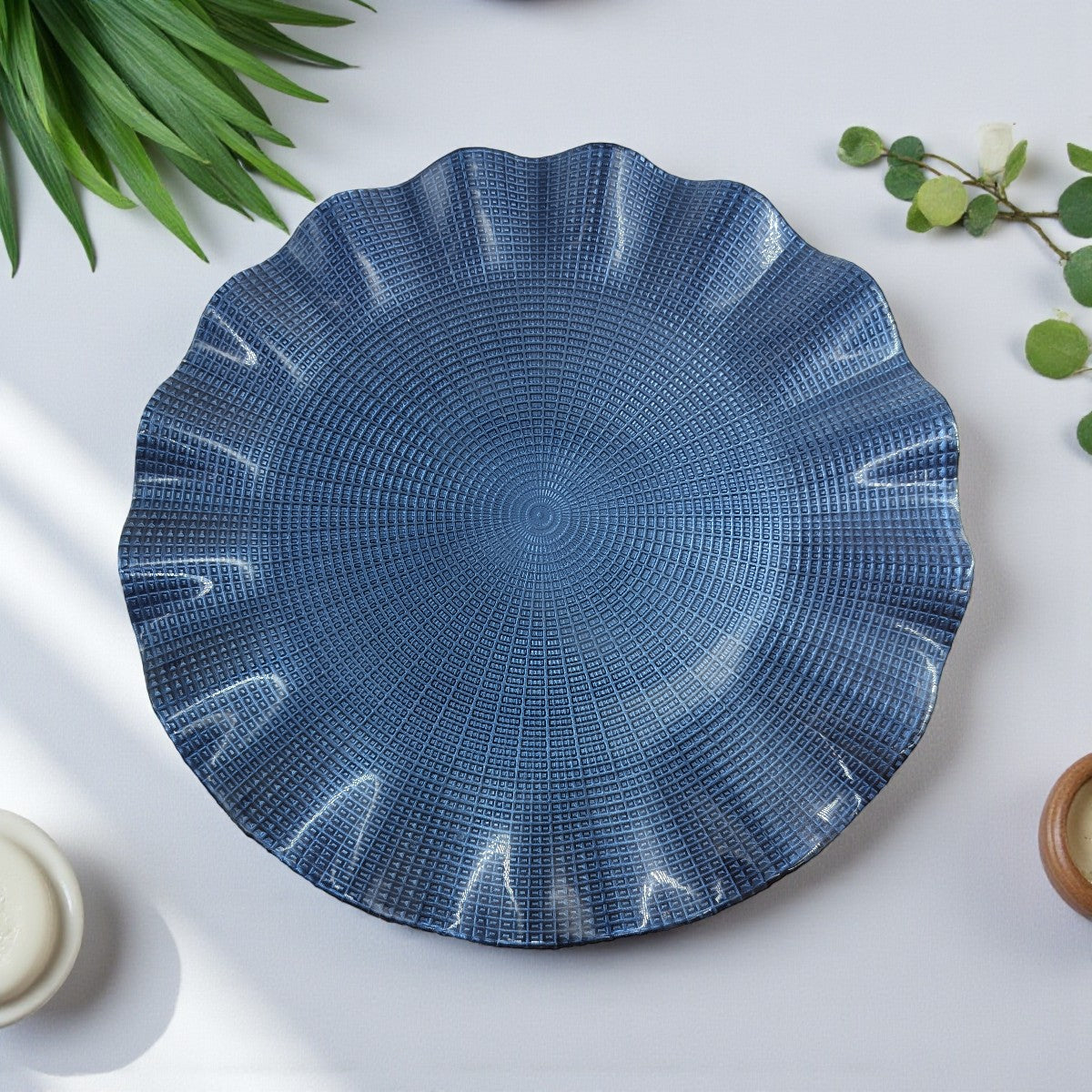 Elevate your dining experience with the Lemon Tree Blue Glass Flat Round Platter, designed with a wavy rim and an exquisite textured finish. Measuring 31.5 cm, this premium glass platter is perfect for serving snacks, desserts, salads, and fruits, making it an ideal choice for festive gifting, hamper platters, and elegant dining setups. Crafted from high-quality coloured glass, this platter is available in four stunning shades – Blue, Green, Brown, and Purple Pink, adding a touch of sophistication to your home décor and table setting.