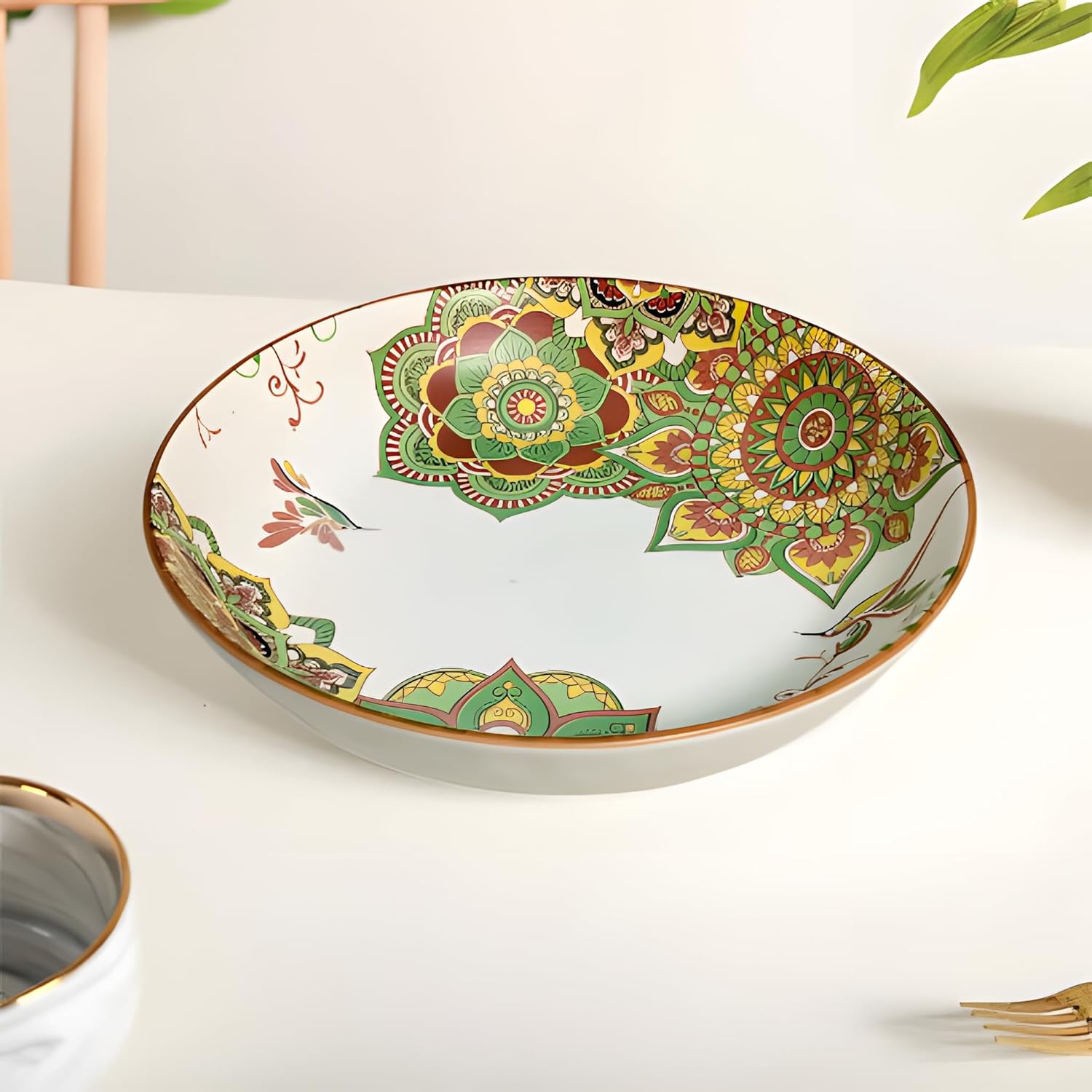 Bring sophistication to your dining with the Lemon Tree Green Ceramic Round Deep Dish Platter, designed for both elegance and practicality. Crafted with high-quality ceramic and a stylish matte glaze, this deep dish is perfect for serving pasta, salads, snacks, fruits, desserts, and more. The chic colored print in blue and green enhances your table setting, making it ideal for everyday meals or special occasions. Lightweight yet durable and easy to hold, this versatile platter is the perfect blend of aesthetics and functionality.