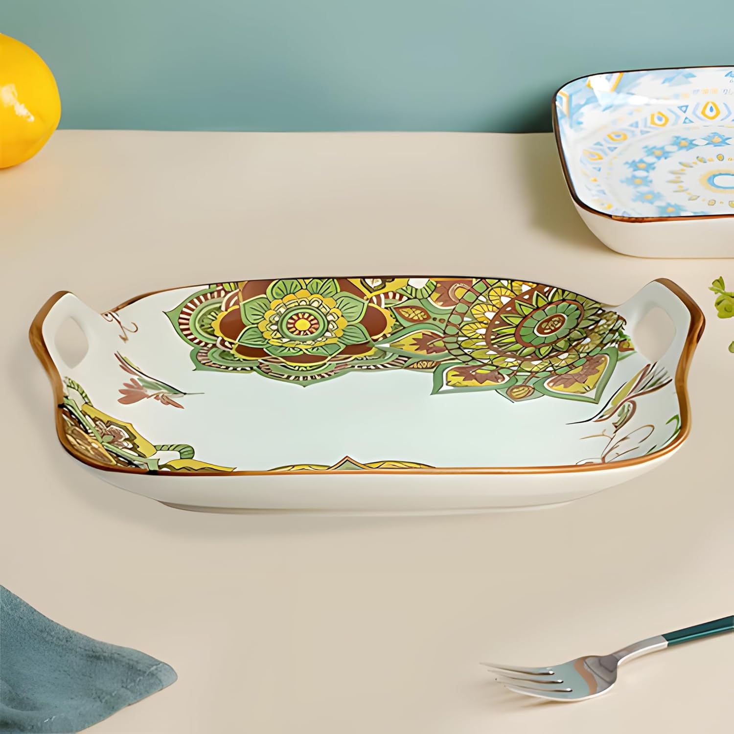 Enhance your dining experience with the Lemon Tree Green Ceramic Square Platter, crafted for both style and functionality. Featuring a modern matte finish and eye-catching printed design, this small-sized platter with double ear handles provides a comfortable grip for effortless serving. Its deep dish design makes it ideal for snacks, desserts, salads, pasta, cookies, fruits, and more. Made from premium ceramic with a durable glazed coating, this multipurpose platter is perfect for everyday use, parties, and gifting. Elevate your serveware collection with this sophisticated and elegant kitchen essential.