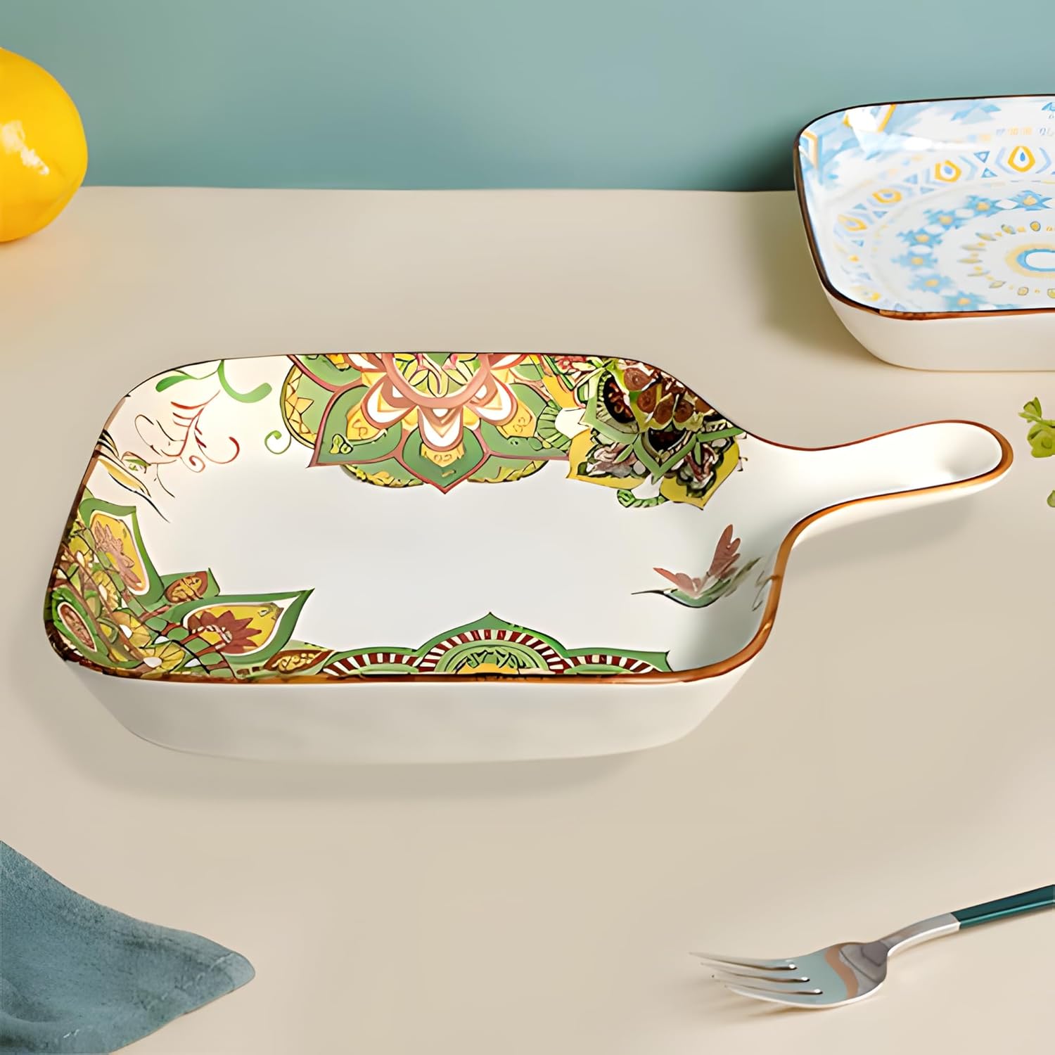 Elevate your dining experience with the Lemon Tree Green Ceramic Square Platter, designed with a sleek matte finish, stylish printed pattern, and a sturdy handle for easy serving. This deep dish platter is perfect for serving snacks, desserts, salads, pasta, fruits, cookies, chips, and more. Made from high-quality ceramic with a durable glazed finish, it ensures longevity and elegance. Whether for everyday use, special occasions, or professional settings, this modern and practical serving dish is a must-have for your tableware collection.