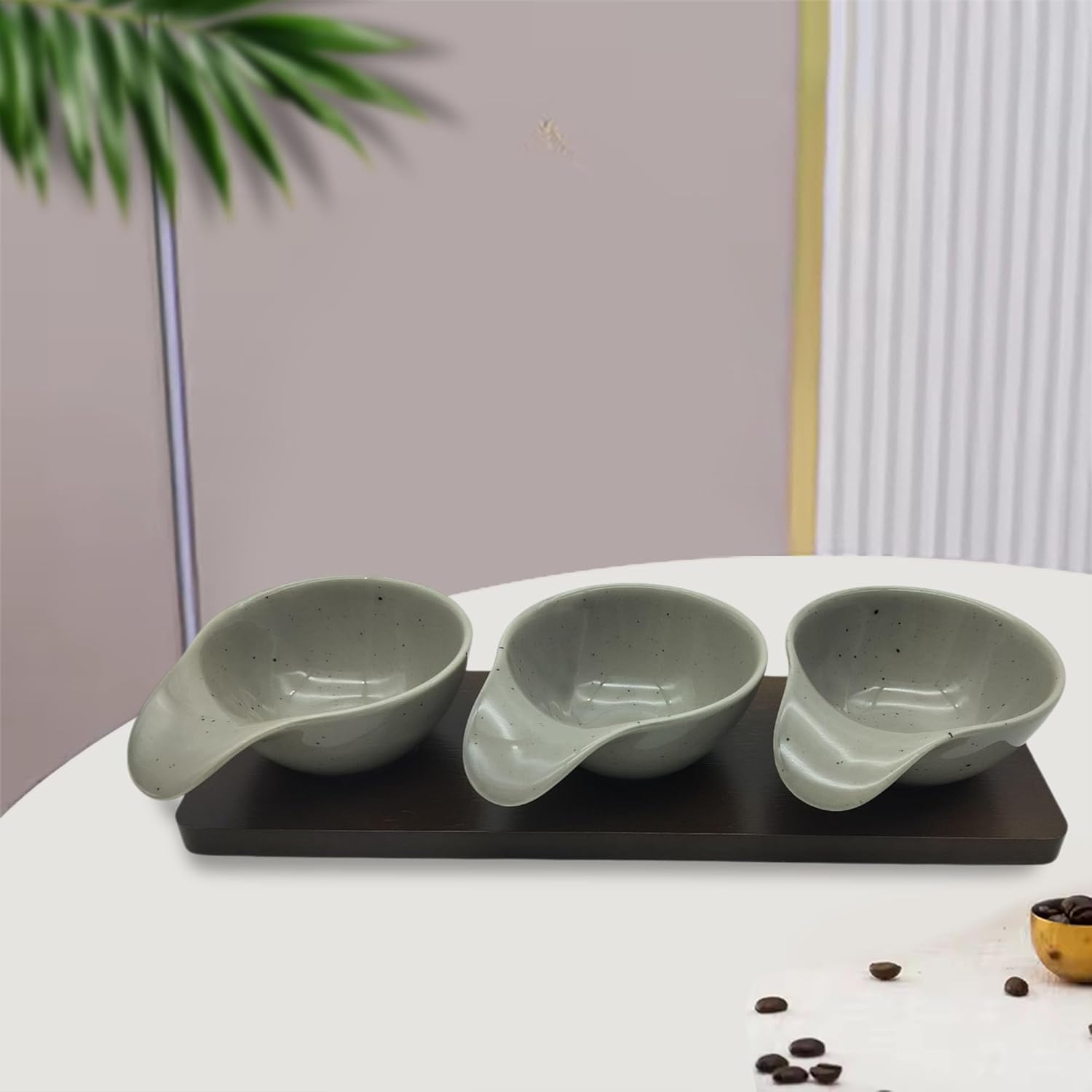 Upgrade your dining experience with the Lemon Tree Grey Ceramic 3-Bowl Set, complete with a sleek bamboo base tray for an elegant and organized serving solution. Designed for chutneys, dips, pickles, nuts, desserts, and snacks, this premium ceramic set offers a refined look while ensuring durability and ease of use. The neutral grey shade, along with other available colors (Beige & Blue), complements any modern or traditional table setting. The compact and lightweight design makes it perfect for everyday use or entertaining guests, adding a touch of sophistication to any occasion.