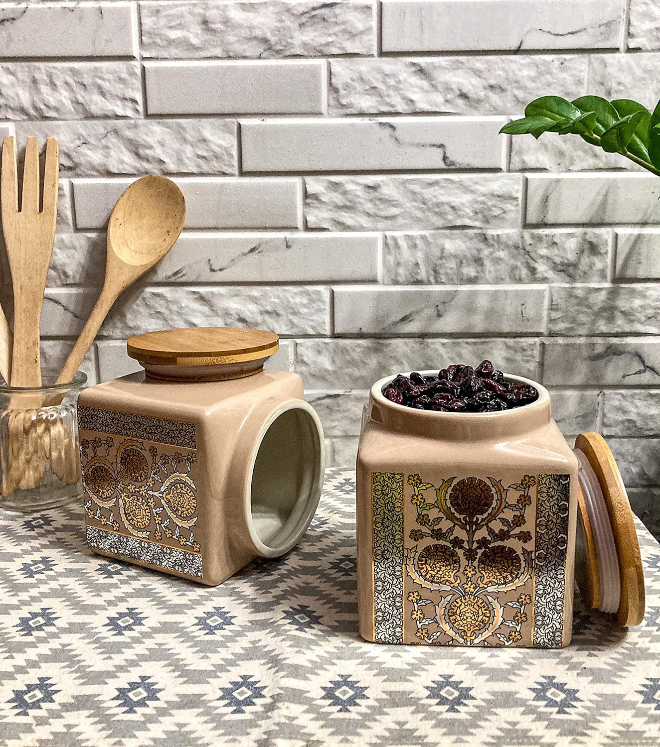 Enhance your kitchen storage with the Lemon Tree Off-White Ceramic Storage Jars, featuring a charming marigold flower print and a glossy finish for a stylish yet functional design. This set of 2 airtight containers (1000ml each) is perfect for storing dry fruits, cookies, snacks, coffee, tea, spices, and more. The high-quality ceramic body ensures durability, while the airtight wooden lids help preserve the freshness and aroma of your stored ingredients. Ideal for kitchen organization, these elegant jars also double as decorative countertop accents.