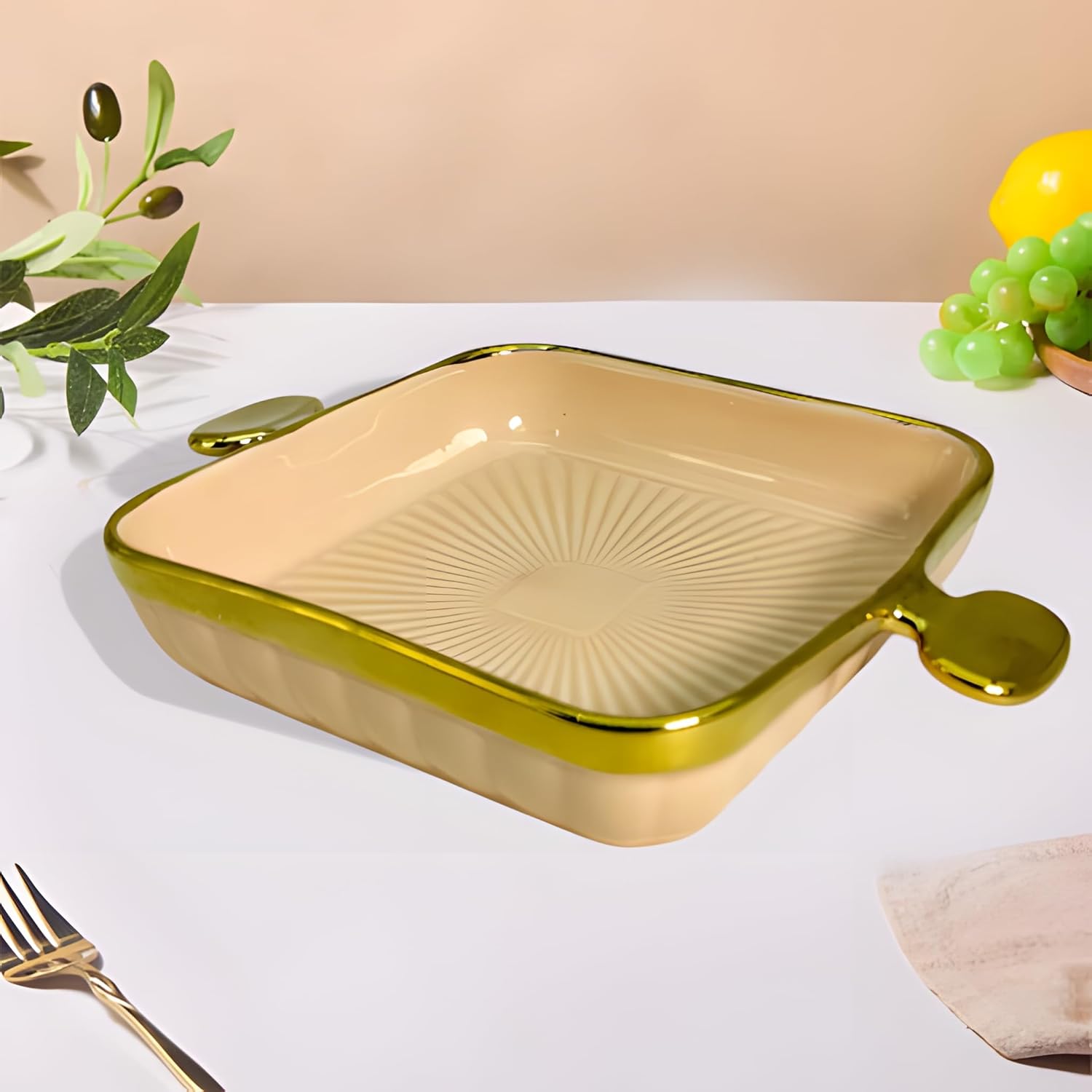 ✔ Premium ceramic square platter with stylish golden rim and handles