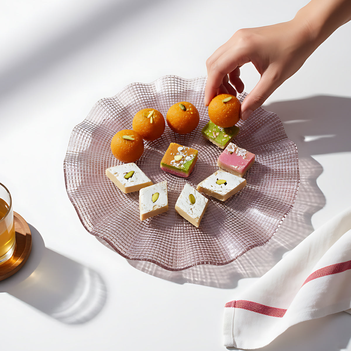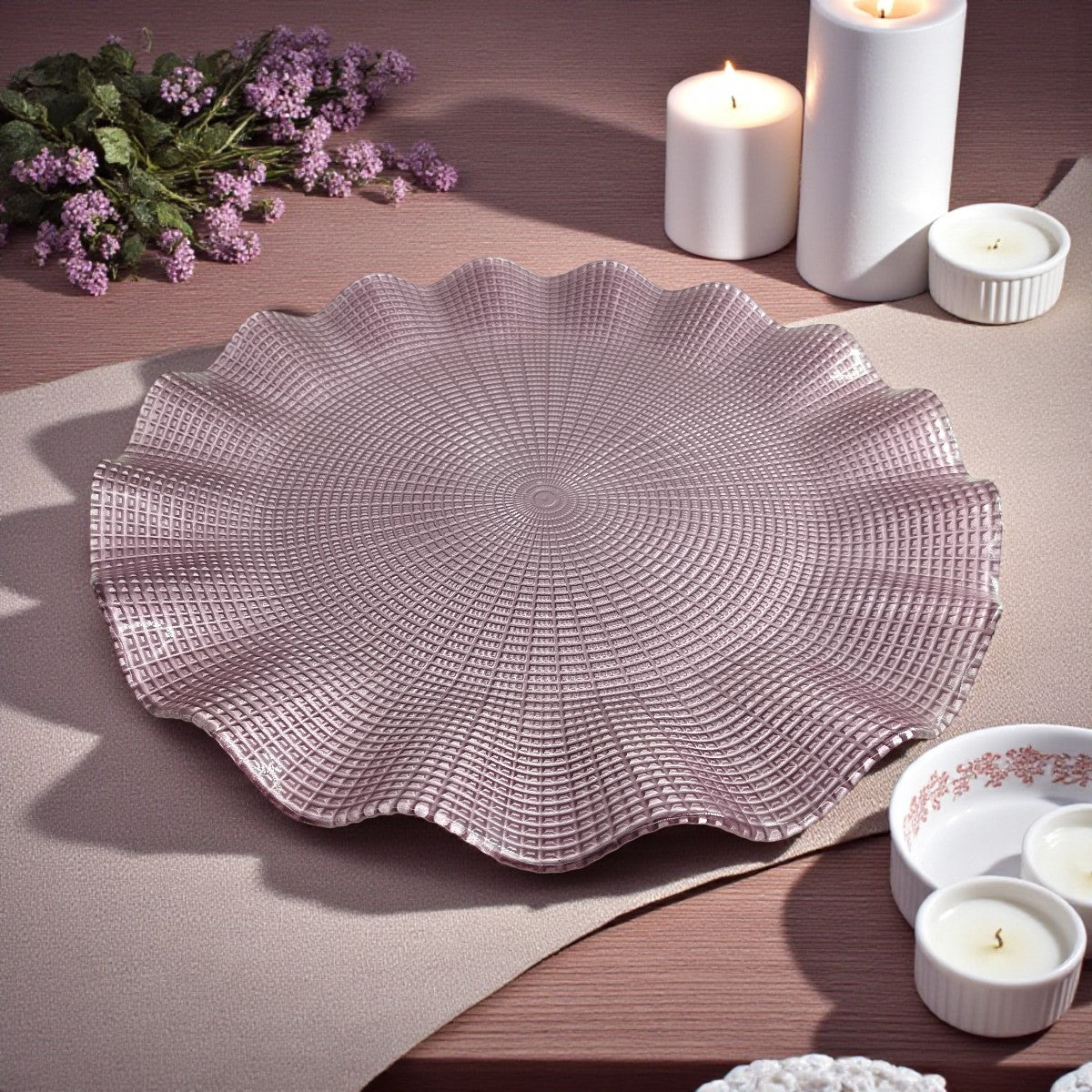 Add a touch of sophistication to your dining table with the Lemon Tree Purple Pink Glass Round Platter, featuring a wavy rim and a luxurious textured finish. With a 31.5 cm diameter, this stunning glass platter is perfect for serving snacks, desserts, salads, and fruits, making it ideal for festive gifting, elegant hampers, and stylish home decor. Crafted from premium quality glass, it offers both durability and a glossy aesthetic, while the vibrant purple-pink hue enhances any table setting. Available in four attractive colors – Blue, Green, Brown, and Purple Pink, this platter is a must-have for those who love unique and stylish serveware.
