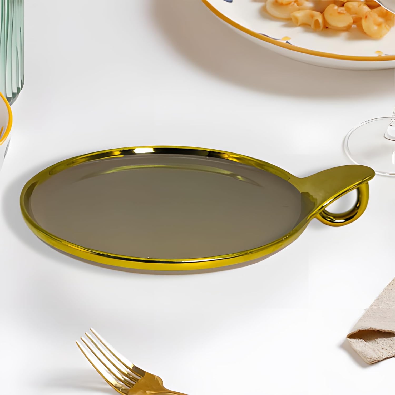 Enhance your table setting with this sophisticated brown round ceramic serving platter, featuring a golden rim and an elegant hook-shaped handle for a stylish and functional design. This high-quality, food-safe ceramic platter measures 24cm x 20cm x 4cm, making it perfect for serving snacks, desserts, fruits, salads, and more. Its shiny finish and gold-accented details add a touch of luxury, making it an ideal choice for home use, dinner parties, and special occasions. Available in Cream, Blue, and Brown, this exquisite piece complements any dining decor.