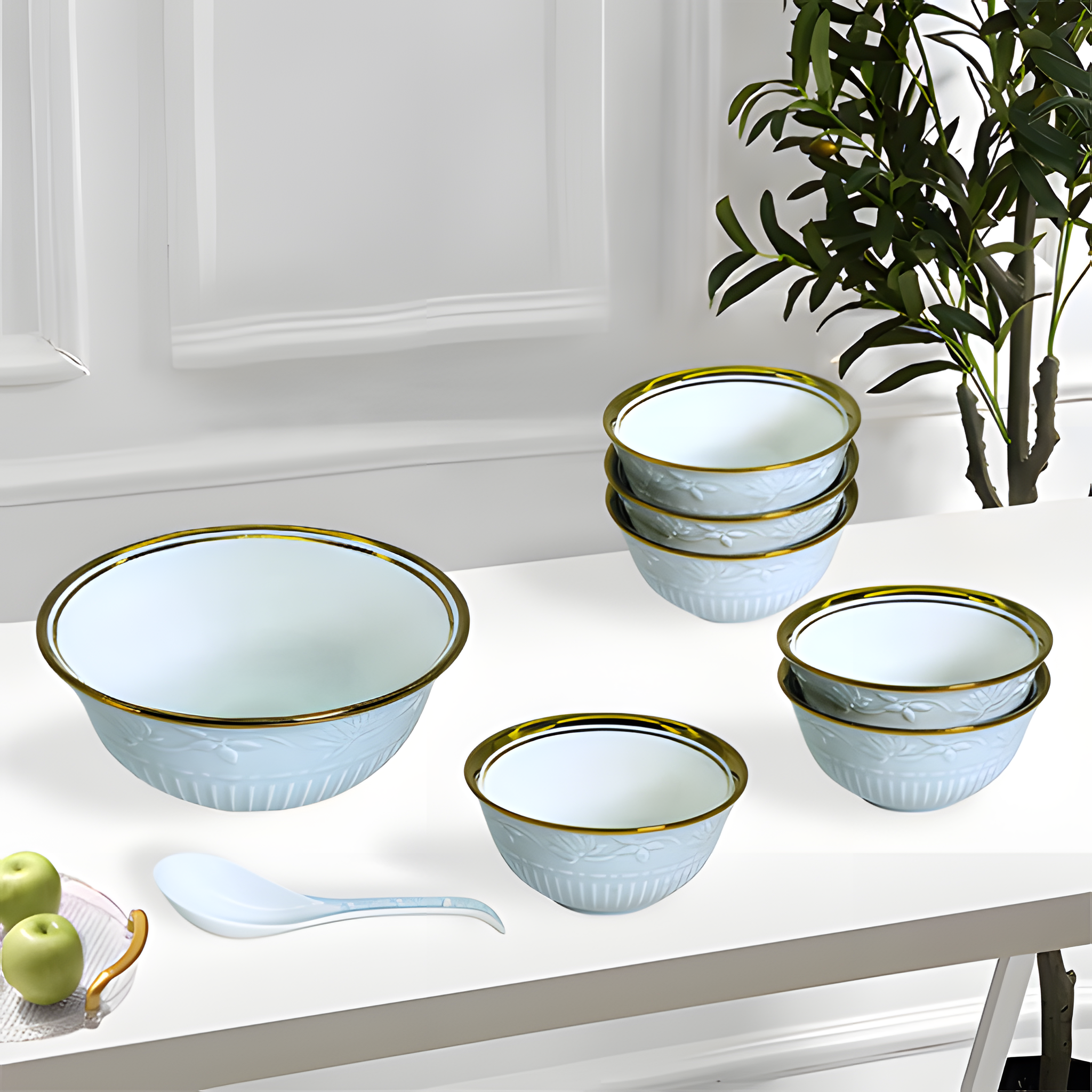 Introduce elegance to your dining experience with the Lemon Tree HB2012 8-Piece Light Blue & Gold Ceramic Dessert & Pudding Set. Designed with a sophisticated embossed pattern and a luxurious gold lining, this set is a perfect blend of style and functionality. It includes one large serving bowl (18 cm x 8 cm, 950 ml), six small bowls (10.2 cm x 5 cm, 250 ml each), and a matching serving spoon (17.5 cm). Made from high-quality ceramic, the set features a super white glossy interior, ensuring a premium and refined look. Whether you’re serving desserts, puddings, ice cream, or snacks, this set elevates every presentation. Packed in a beautiful gift box, it’s an excellent choice for gifting at weddings, housewarmings, and special celebrations.