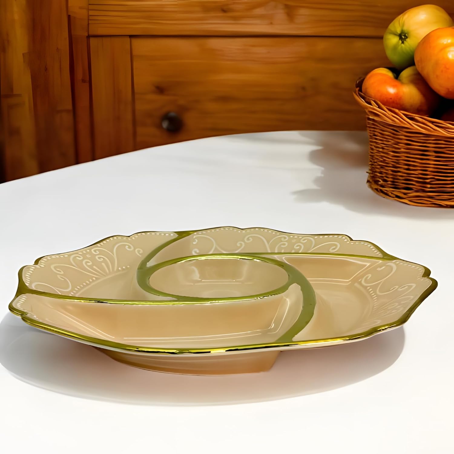 Serve in style with this elegant Peach Round Deep Partition Platter featuring a central dip slot and gold-rimmed edges for a sophisticated touch. Made from premium-quality ceramic, this platter is perfect for chips, dips, nuts, desserts, nachos, fruits, and more. Designed for both casual and special occasions, it is available in three charming pastel shades – Peach, Blue, and Green. Durable, easy to clean, and stylish, this serving dish is a must-have for modern kitchens and party setups.