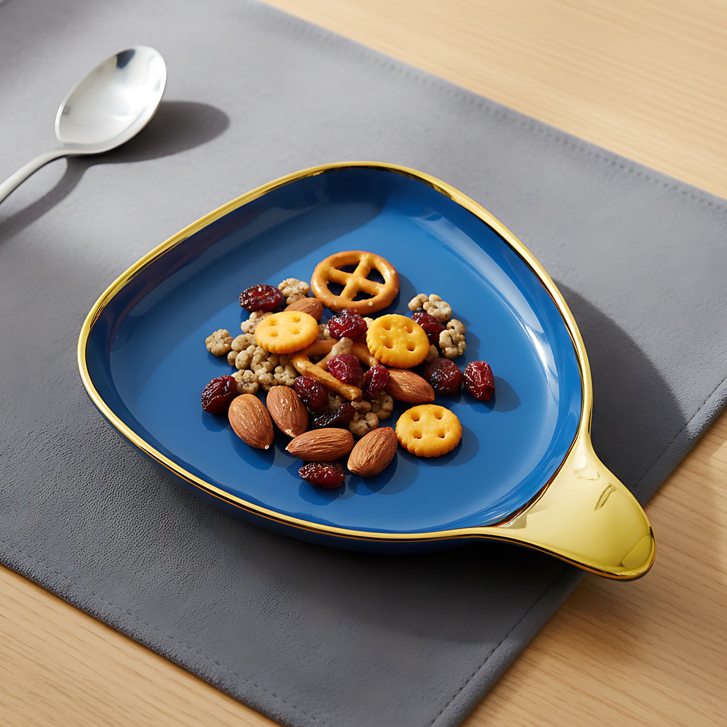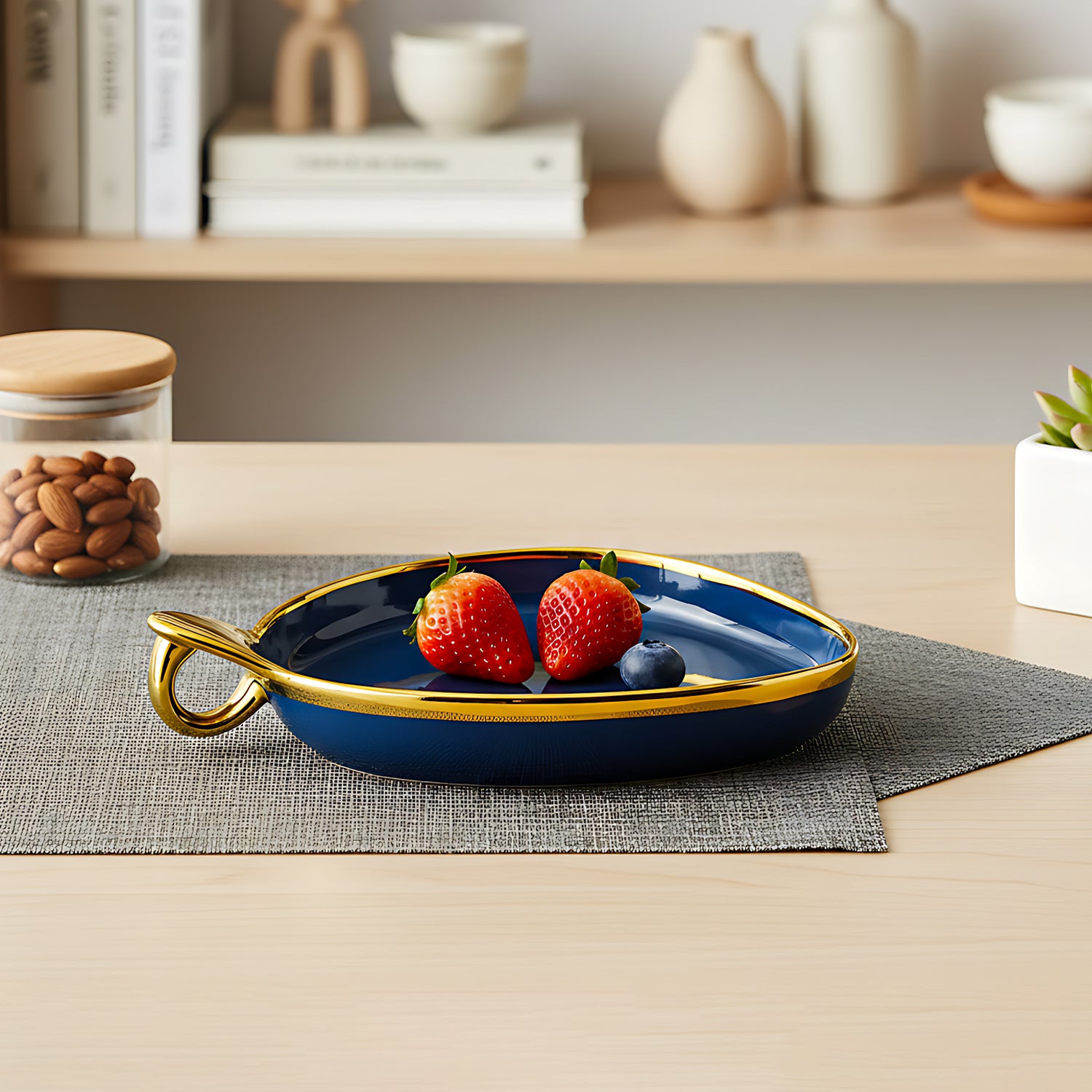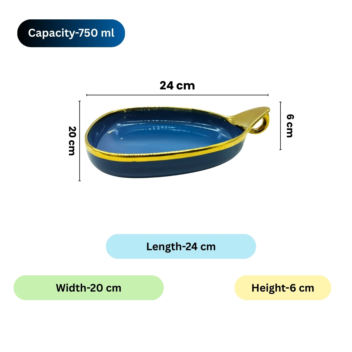 Serve in style with this premium blue ceramic deep triangular platter, designed with a luxurious golden rim and a unique hook-shaped handle. Its wide and deep design makes it ideal for serving snacks, salads, desserts, fruits, chips, nachos, and more. Crafted from high-quality, food-safe ceramic, this platter adds an elegant touch to any table setting. The shiny glazed finish enhances its appeal, making it perfect for both everyday use and special occasions. Available in Blue and Cream, this 24cm x 20cm x 6cm platter is a must-have for stylish serving.