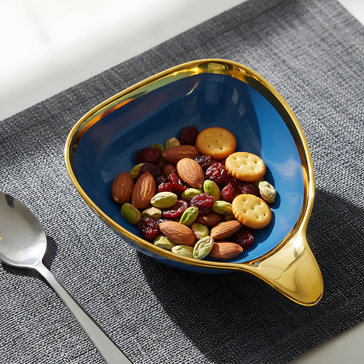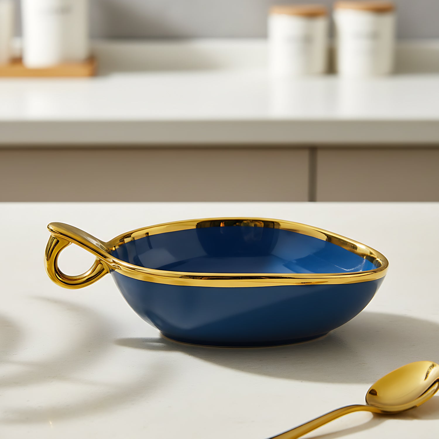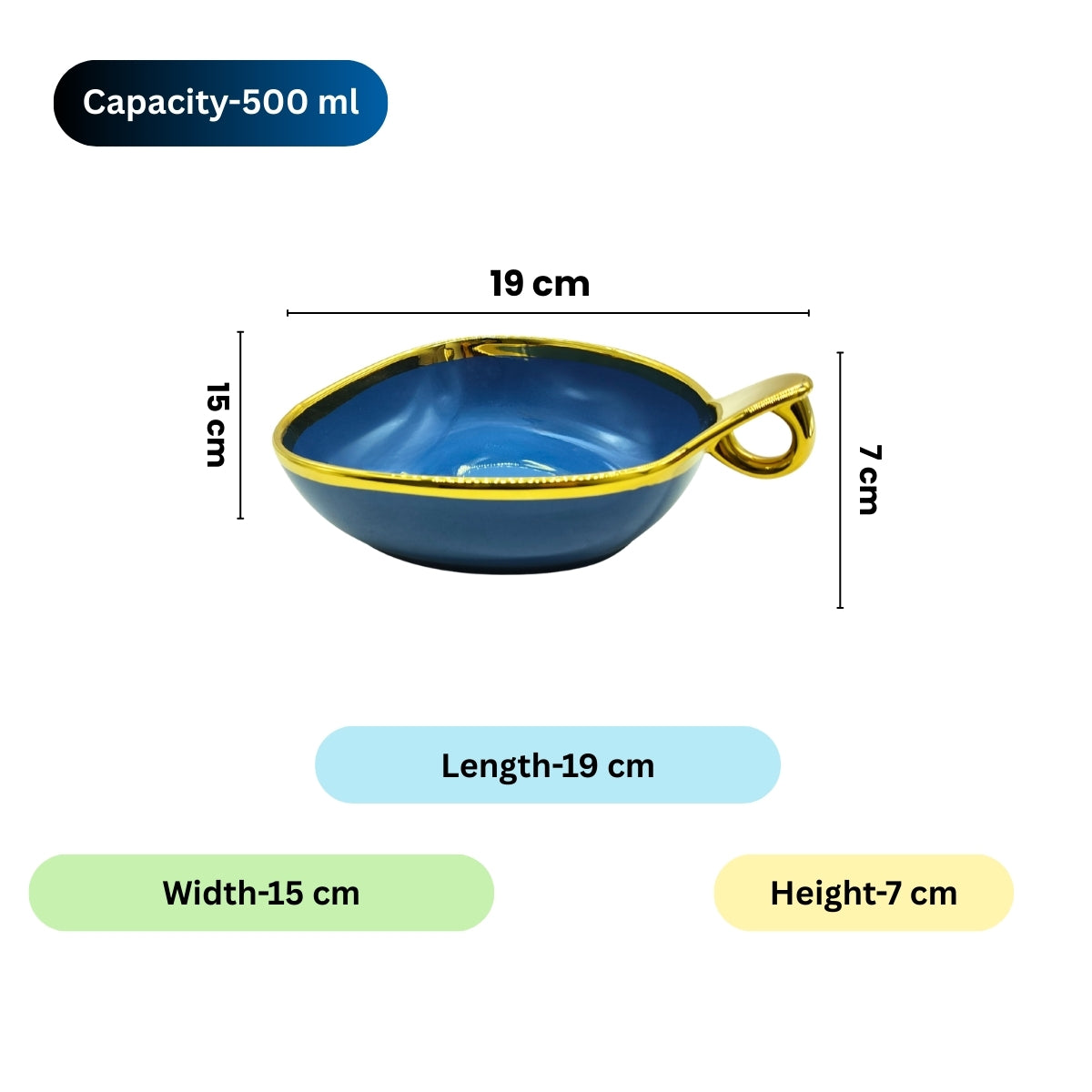 Enhance your table setting with this modern blue ceramic deep serving bowl, featuring a unique triangular shape, luxurious gold rim, and ergonomic hook handle for easy serving. Perfect for snacks, salads, desserts, fruits, nachos, chips, and more, this 19cm x 15cm bowl with a 7cm depth is designed for both style and functionality. Crafted from premium food-safe ceramic, it ensures durability while adding an elegant touch to any dining experience. Available in Blue, Cream, and Brown, making it a perfect choice for any home or gifting purpose.